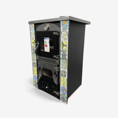 The Esmeralda Wood-Burning Stove with Caltagirone Majolica is not just a cooking and heating appliance, but a true piece of design. The majolica tiles, crafted by master artisans from Caltagirone, transform this stove-oven into a decorative element that captures attention and enriches the environment. Despite its compact dimensions of H. 95 cm - W. 60 cm - D. 56 cm and weighing approximately 110 kg, this versatile appliance incorporates three essential functions: a powerful wood-burning stove for heating, an oven for elaborate preparations, and a practical cooktop for daily use, offering a complete solution for heating and cooking needs in limited spaces.