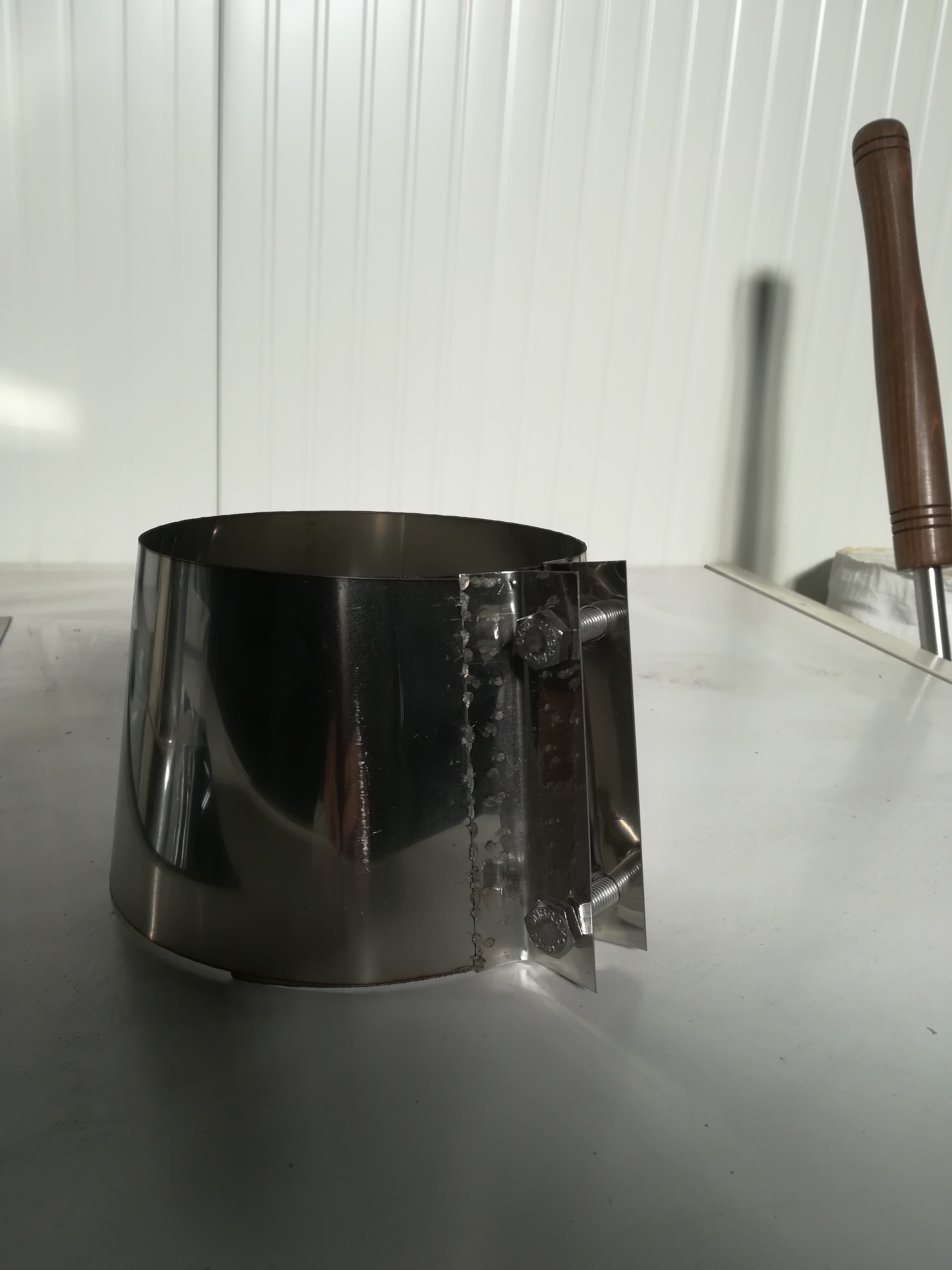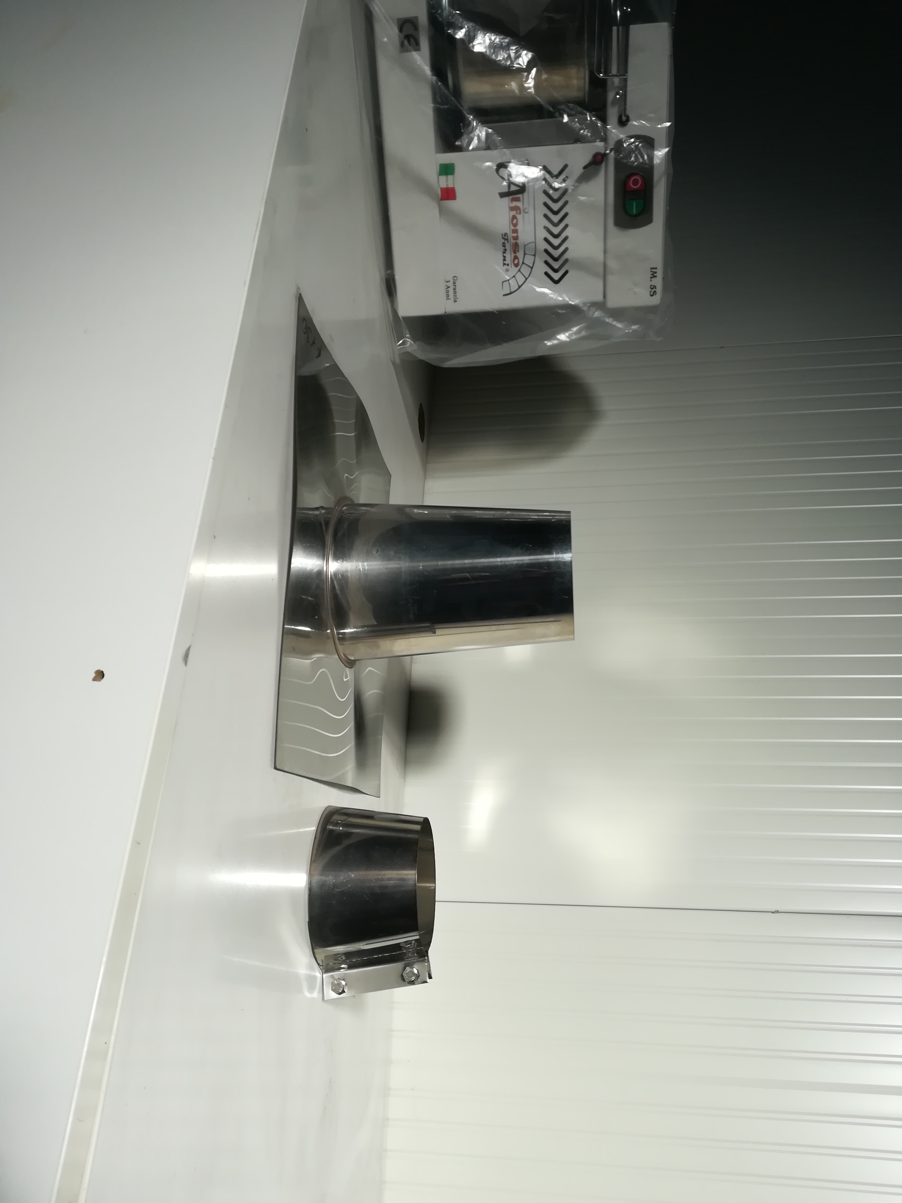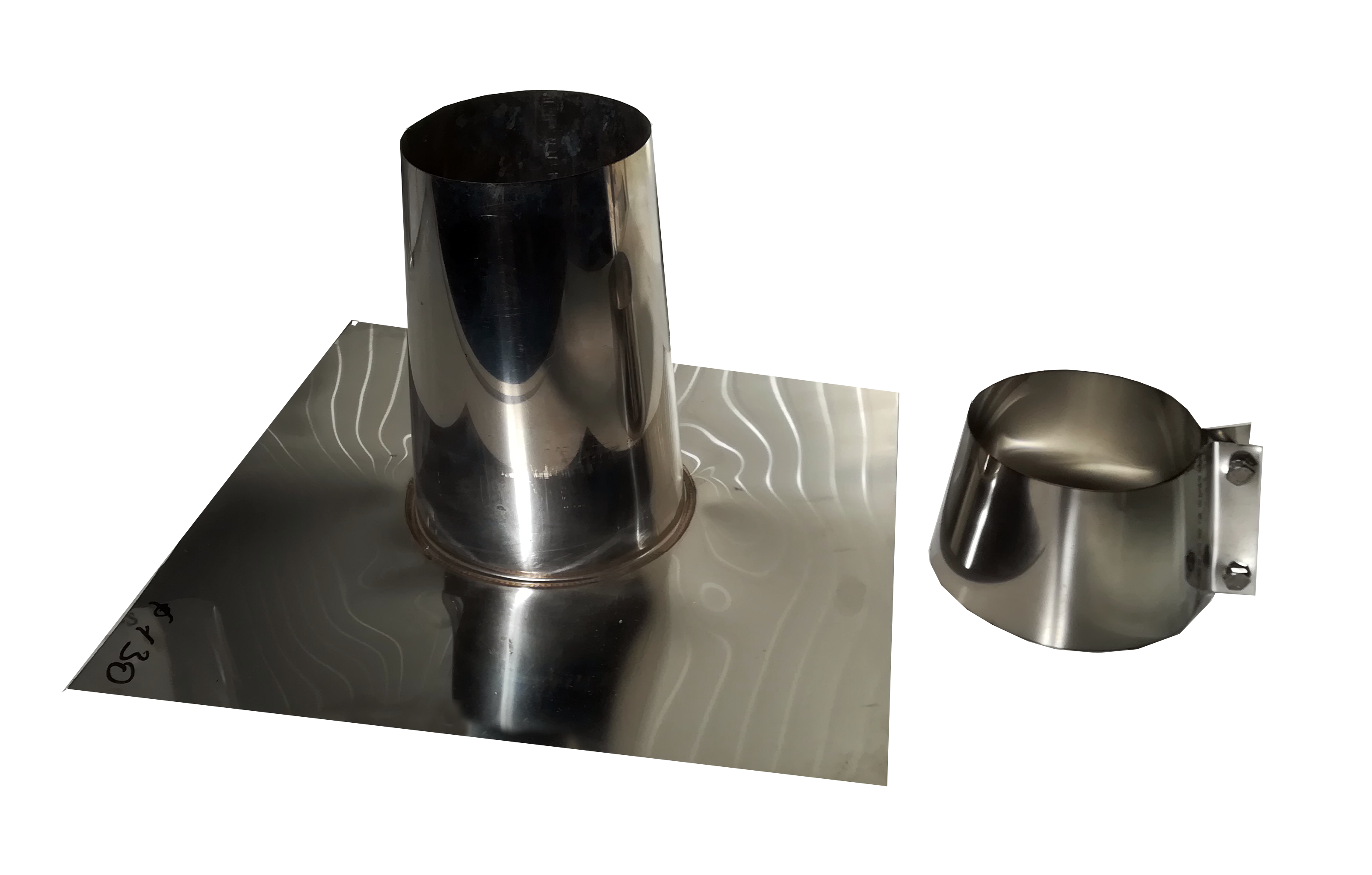 Plaque de parement droite utilisée pour réaliser un passage de cloison dans les auvents. Créer le trou, insérer la section conique soudée à la base, insérer le tuyau d'évacuation et serrer l'attache du tuyau d'évacuation Ø130mm.