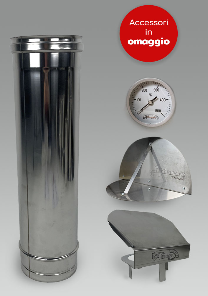 Il package include in omaggio, un sistema di evacuazione fumi di alta qualità composto da canna fumaria in acciaio inox e un comignolo. Questi componenti essenziali ottimizzano il tiraggio e la ventilazione, creando un ambiente di cottura ideale e sicuro.
